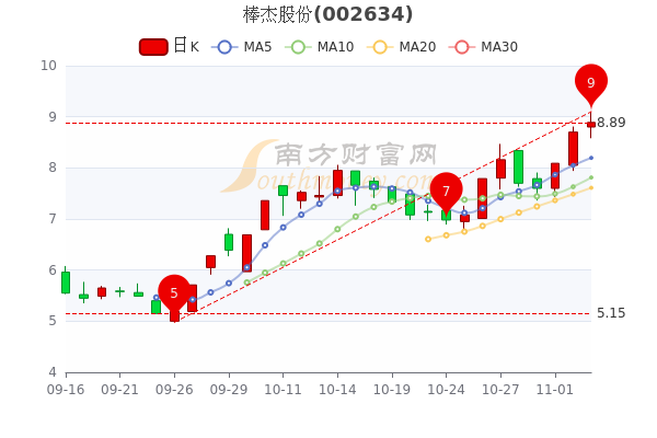 11月3日棒杰股份(002634)开盘报8.8元,截至15点,该股报8.890元涨1.61%,成交2亿元,换手率6.12%。