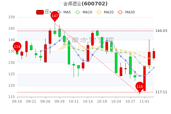 11月3日舍得酒业开盘报价131.98元,收盘于135.010元,涨0.13%。当日最高价为136.4元,最低达131.02元,成交量653.08万手,总市值为448.28亿元。