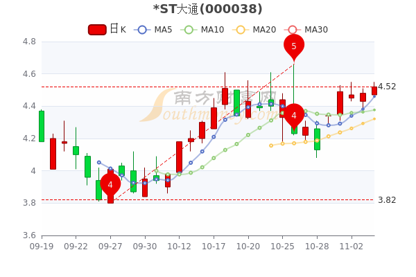 11月4日消息,ST大通开盘报价4.47元,收盘于4.520元,涨0.89%。当日最高价4.55元,最低达4.47元,总市值23.63亿。