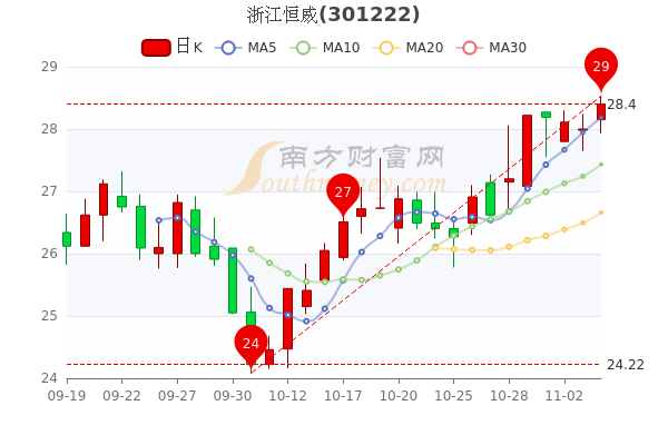 11月4日收盘消息,浙江恒威5日内股价上涨0.63%,今年来涨幅下跌-108.38%,最新报28.400元,涨1.43%,市盈率为24.07。
