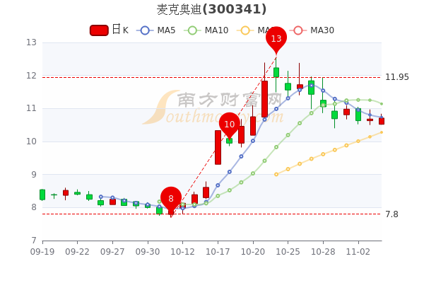 11月4日,麦克奥迪开盘报价10.52元,收盘于10.710元,涨0.28%。当日最高价为10.84元,最低达10.51元,成交量1244.59万手,总市值为54.98亿元。