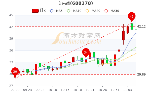 11月7日奥来德(688378)开盘报41.46元,截至15时收盘,该股报41.400元涨0.6%,成交9492.31万元,换手率3.38%。
