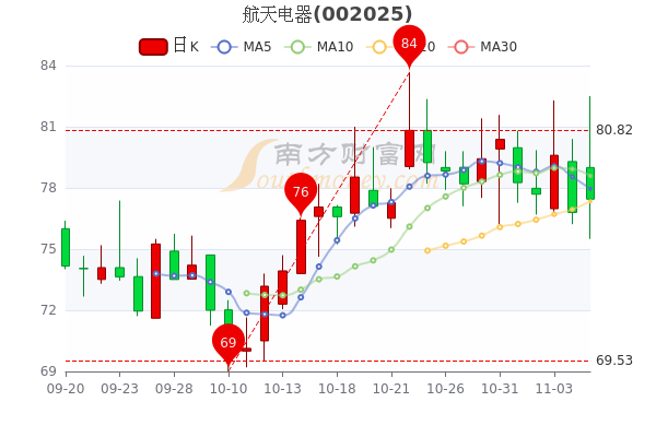 11月7日晚间复盘消息,航天电器(002025)涨0.85%,报77.450元,成交额19.02亿元。