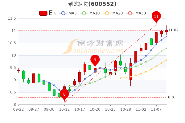 11月9日盘中消息,凯盛科技截至13时54分,该股报11.070元,涨0.27%,7日内股价上涨11.93%,总市值为84.56亿元。