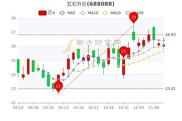 11月10日讯息,虹软科技3日内股价下跌1.46%,市值为106.01亿元,跌0.34%,最新报26.110元。