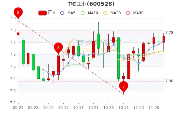 11月10日盘后消息,中铁工业开盘报7.7元,截至15时收盘,该股涨0.65%,报7.750元,总市值为172.17亿元,PE为9.94。