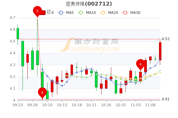 11月10日消息,思美传媒5日内股价上涨5.57%,今年来涨幅下跌-16.93%,最新报4.490元,市盈率为43.98。