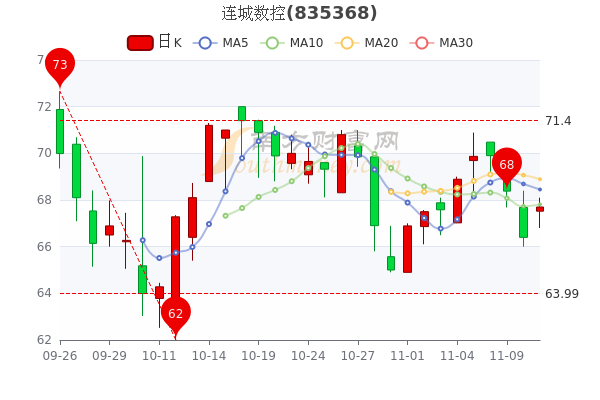 11月11日消息,连城数控开盘报67.52元,截至下午三点收盘,该股涨1.96%,报67.640元。换手率0.32%,振幅涨1.87%。
