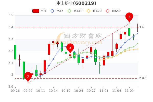 11月11日消息,南山铝业3日内股价上涨2.35%,最新报3.410元,涨2.41%,成交额3.88亿元。