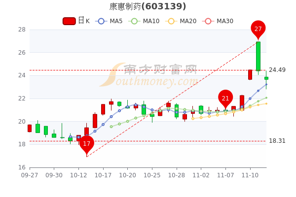11月14日消息,康惠制药开盘报23.87元,截至下午3点收盘,该股跌4.59%,报23.660元。换手率6.78%,振幅跌3.03%。