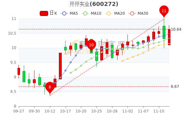 11月14日开开实业(600272)开盘报10.1元,截至15时收盘,该股报10.640元涨2.62%,成交1.5亿元,换手率8.92%。