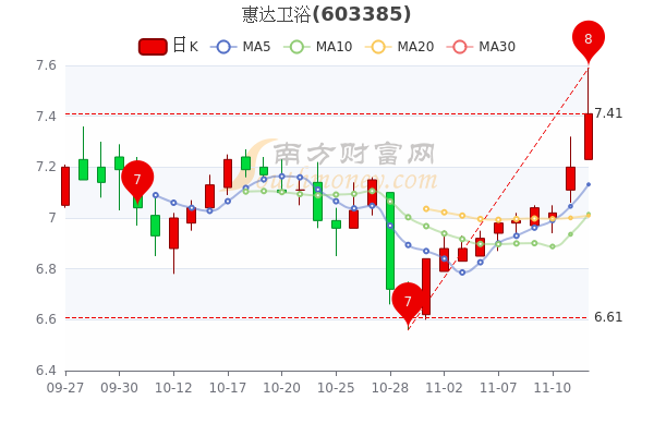 11月14日晚间复盘消息,惠达卫浴开盘报价7.23元,收盘于7.410元。5日内股价上涨5.67%,总市值为28.42亿元。
