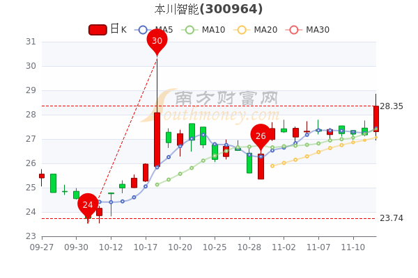 11月14日消息,本川智能开盘报价27.3元,收盘于28.350元,涨2.58%。当日最高价28.86元,最低达26.94元,总市值21.91亿。
