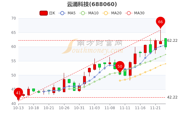 11月23日消息,云涌科技最新报59.910元,跌3.23%。成交量75.57万手,总市值为35.95亿元。