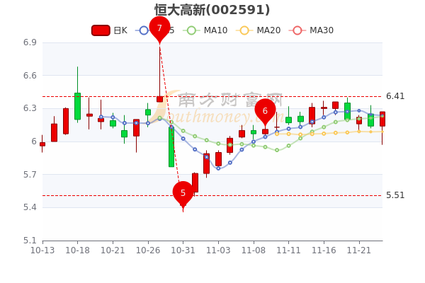11月23日盘后消息,恒大高新最新报6.270元,成交量1732.06万手,总市值为18.82亿元。