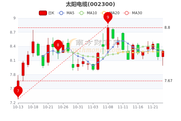 11月23日盘后消息,太阳电缆开盘报价8.18元,收盘于8.300元。7日内股价下跌1.57%,总市值为54.5亿元。