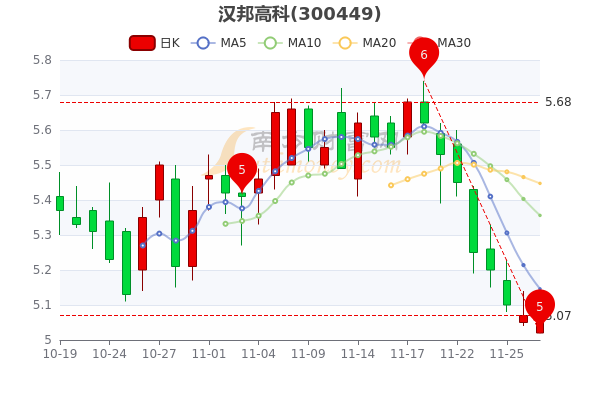 11月29日消息,汉邦高科5日内股价下跌7.5%,该股最新报5.110元涨0.79%,成交357.03万元,换手率0.24%。