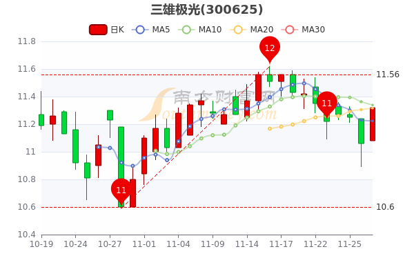 11月29日盘中消息,三雄极光7日内股价下跌3.35%,最新涨2.35%,报11.200元,换手率0.09%。