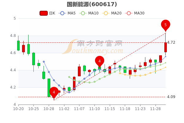 11月30日消息,国新能源截至10时41分,该股涨3.5%,报4.720元,5日内股价上涨2.63%,总市值为65.04亿元。