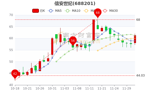 12月1日消息,信安世纪开盘报58.06元,截至15时收盘,该股涨6.13%,报61.290元。换手率3.58%,振幅涨6.37%。