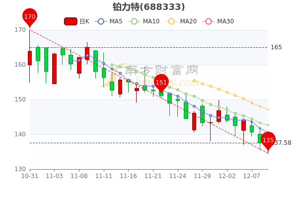12月9日收盘最新消息,铂力特5日内股价下跌2.99%,截至下午3点收盘,该股报138.320元涨0.54% 。