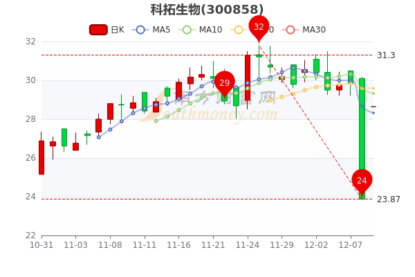 12月9日科拓生物3日内股价下跌4.19%,截至15时,该股报28.640元涨19.98%,成交2346.57万元,换手率1.54%。