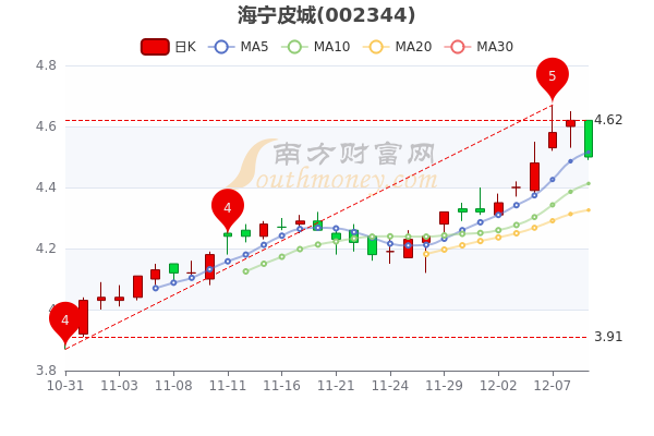12月9日海宁皮城3日内股价下跌1.78%,截至15点收盘,该股报4.500元跌2.6%,成交9440.19万元,换手率1.63%。