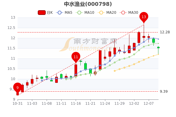 12月9日消息,中水渔业开盘报价11.56元,收盘于11.510元,跌2.29%。当日最高价11.61元,最低达11.2元,总市值42.11亿。