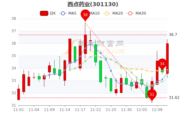 12月12日盘后消息,西点药业最新报35.990元,涨6.11%。成交量402.83万手,总市值为29.08亿元。