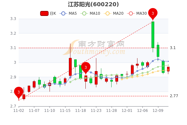 12月13日盘后消息,江苏阳光5日内股价下跌1.01%,今年来涨幅上涨7.41%,最新报2.970元,涨0.68%,市盈率为46.05。