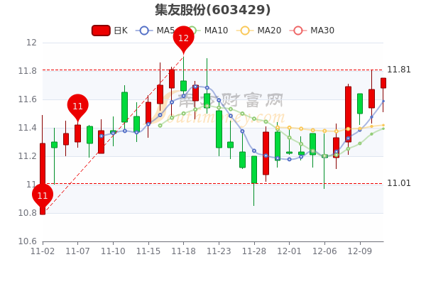 12月13日集友股份开盘报价11.68元,收盘于11.750元。当日最高价为11.73元,最低达11.51元,成交量352.43万手,总市值为61.63亿元。