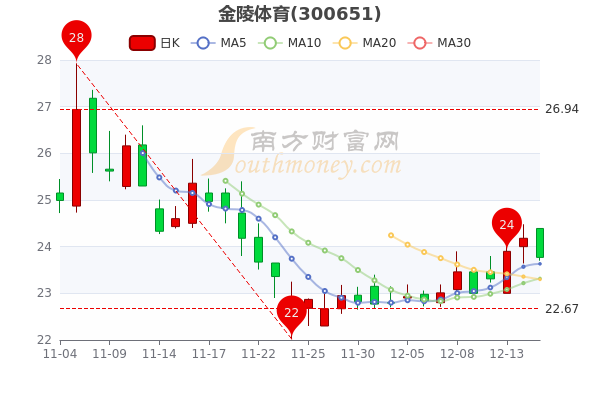 12月15日盘中消息,金陵体育开盘报24.39元,截至11时11分,该股跌1.7%,报23.930元,总市值为30.81亿元,PE为118.35。