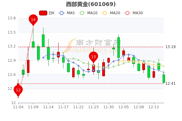 西部黄金(601069)跌2.2%,报12.570元,成交额928.88万元,换手率0.12%,振幅跌1.1%。