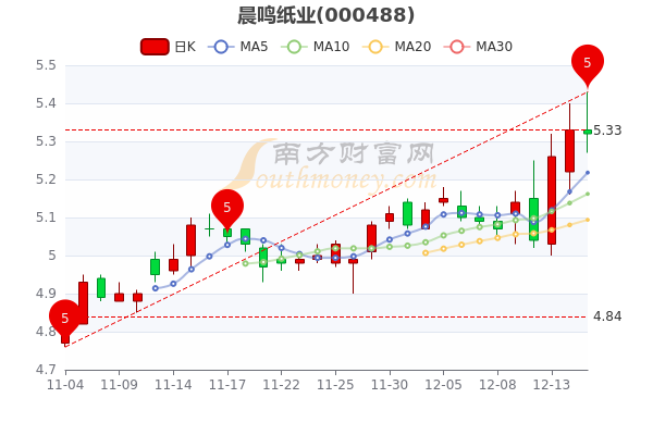 12月15日晨鸣纸业上午收盘消息,7日内股价上涨2.09%,今年来涨幅下跌-40.11%,最新报5.330元,跌0.38%,市值为158.82亿元。