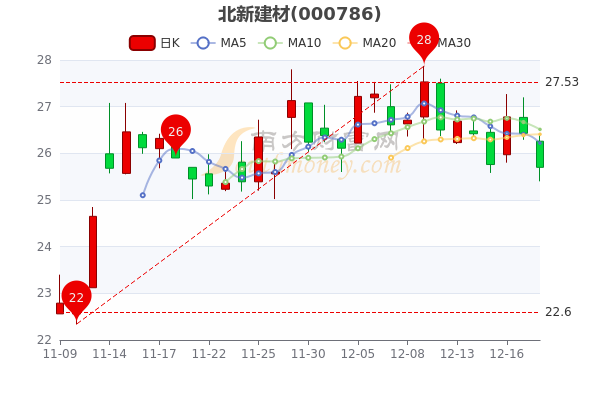 12月20日消息,北新建材5日内股价下跌3.85%,最新报25.700元,成交量1014.32万手,总市值为434.2亿元。