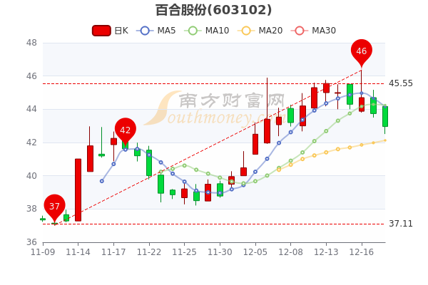 12月20日,百合股份开盘报价44.17元,收盘于42.960元,跌1.78%。今年来涨幅下跌-41.25%,总市值为27.49亿元。