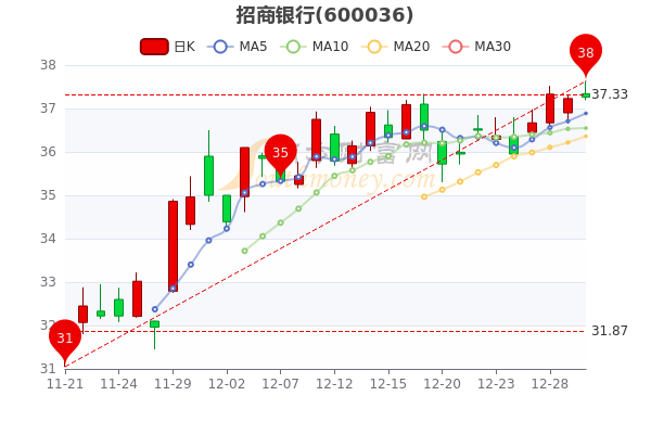 12月30日消息,招商银行收盘于37.410元,涨0.08%。7日内股价上涨2.51%,总市值为9434.74亿元。