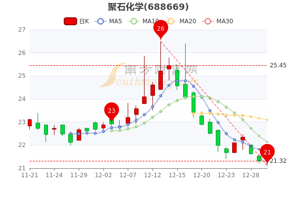 12月30日收盘消息,聚石化学开盘报价21.35元,收盘于21.440元。5日内股价下跌3.12%,总市值为20.01亿元。