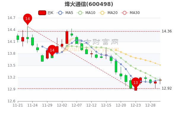 12月30日收盘消息,烽火通信最新报13.140元,涨0.38%。成交量172.3万手,总市值为155.91亿元。