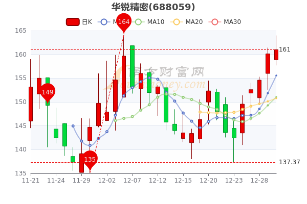 12月30日,华锐精密开盘报价158.87元,收盘于161.000元,涨0.56%。总市值为70.85亿元。
