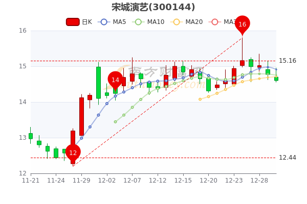 12月30日宋城演艺3日内股价下跌2.88%,截至15时收盘,该股报14.600元跌1.15%,成交4.07亿元,换手率1.21%。