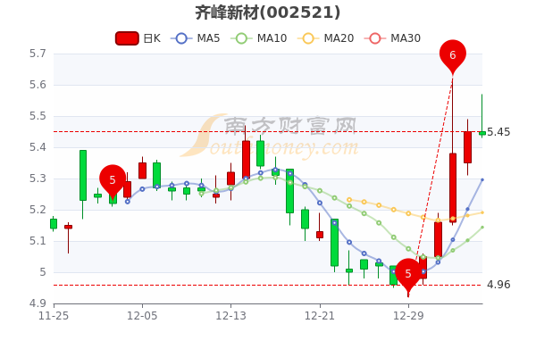 1月6日消息,齐峰新材最新报5.440元,跌0.18%。成交量632.62万手,总市值为26.91亿元。