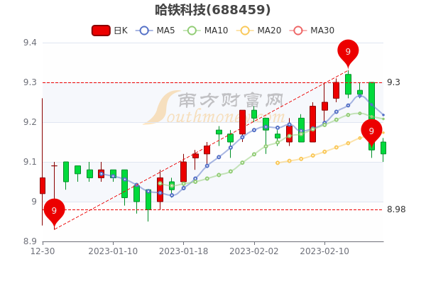 2月17日收盘消息,哈铁科技开盘报价9.15元,收盘于9.120元。7日内股价下跌1.32%,总市值为43.78亿元。