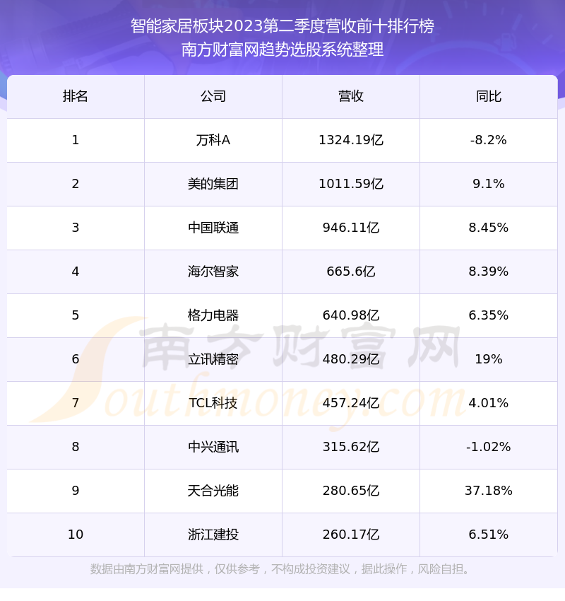 按照南方财富网趋势选股系统统计,该股所属板块为智能家居板块,该板块共有269只股票,欧普照明2023第二季度营收在该板块中排名为第72名,该板块2023第二季度营收排名前十的股票如下表: