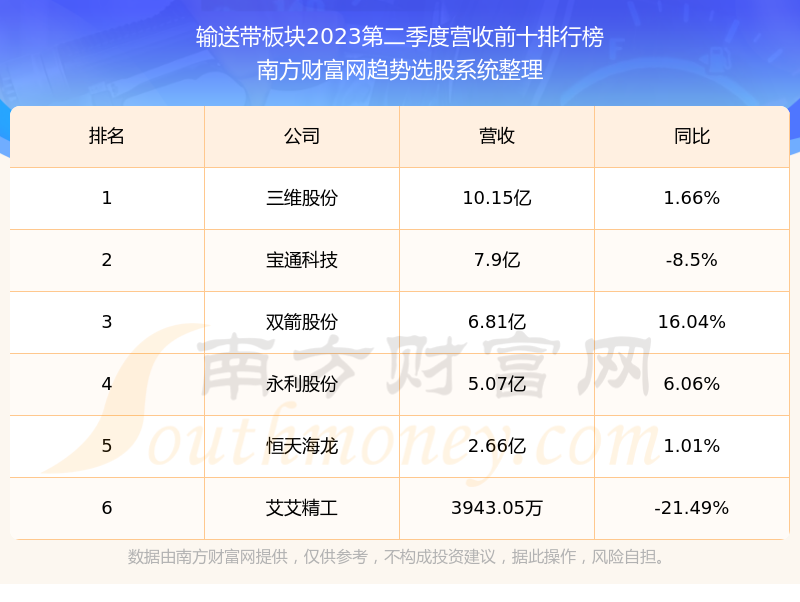 按照南方财富网趋势选股系统统计,该股所属板块为输送带板块,该板块共有6只股票,艾艾精工2023第二季度营收在该板块中排名为第6名,该板块2023第二季度营收排名前十的股票如下表:
