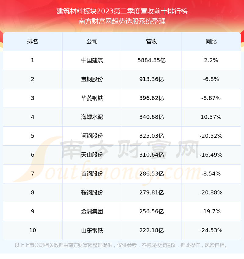 按照南方财富网趋势选股系统统计,该股所属板块为建筑材料板块,该板块共有123只股票,美凯龙2023第二季度营收在该板块中排名为第123名,该板块2023第二季度营收排名前十的股票如下表: