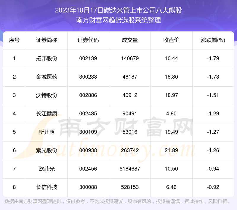 以上内容就是对【山西股票配资 数据解盘|2023年10月17日碳纳米管上市公司八大熊股一览】的解答,如果解决了您的问题欢迎把链接分享给朋友(https://www.anancha.cn/news-gupiaojiaoliu/48604.html)