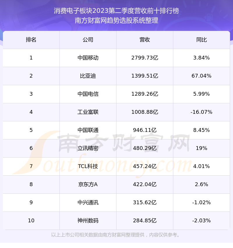 按照南方财富网趋势选股系统统计,该股所属板块为消费电子板块,该板块共有290只股票,松井股份2023第二季度营收在该板块中排名为第241名,该板块2023第二季度营收排名前十的股票如下表: