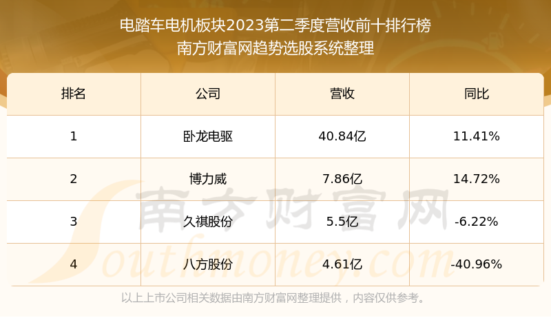 按照南方财富网趋势选股系统统计,该股所属板块为电踏车电机板块,该板块共有4只股票,八方股份2023第二季度营收在该板块中排名为第4名,该板块2023第二季度营收排名前十的股票如下表: