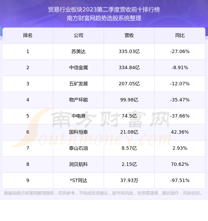 按照南方财富网趋势选股系统统计,该股所属板块为贸易行业板块,该板块共有9只股票,厦门国贸2023第二季度营收在该板块中排名为第9名,该板块2023第二季度营收排名前十的股票如下表: